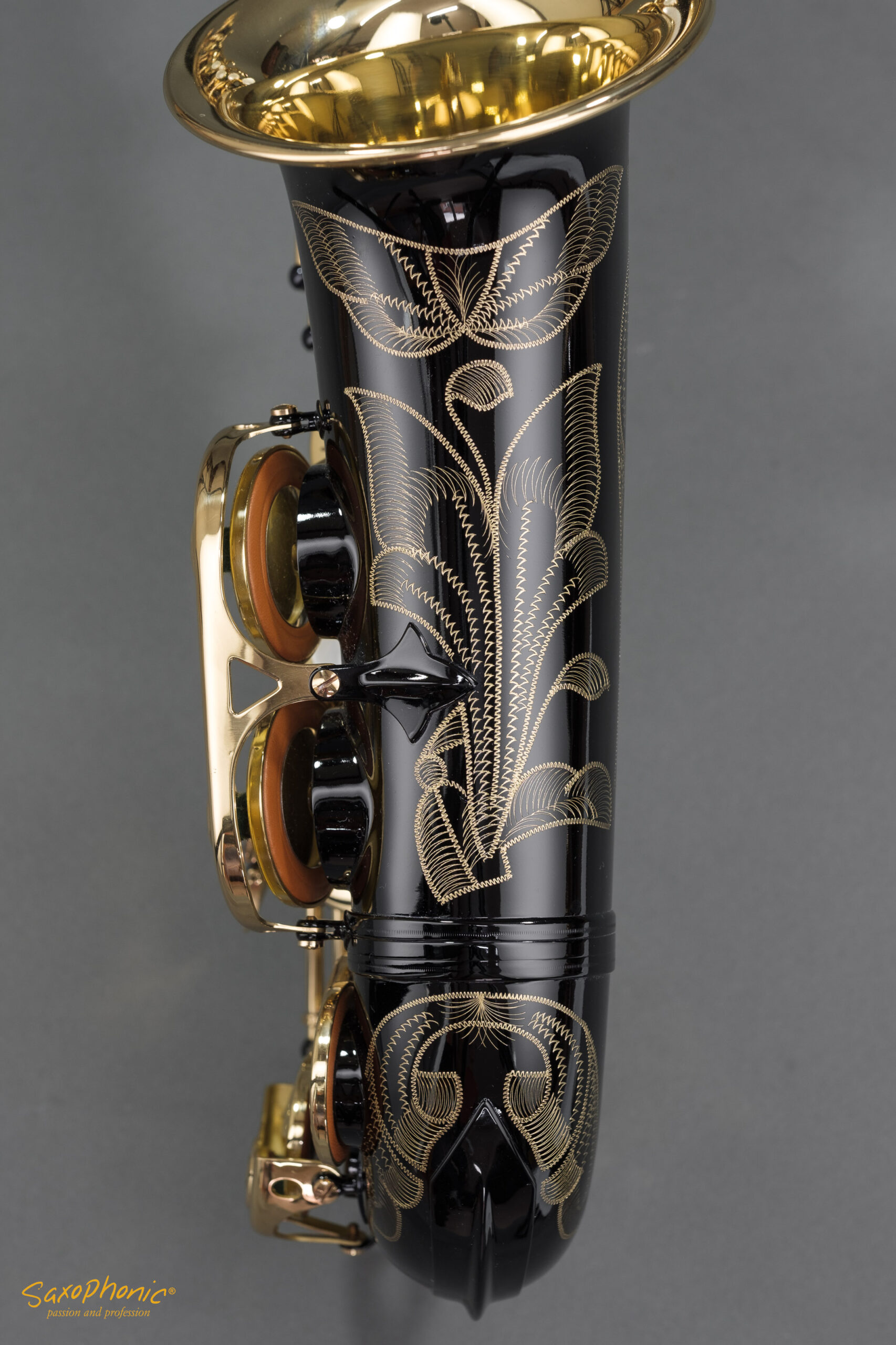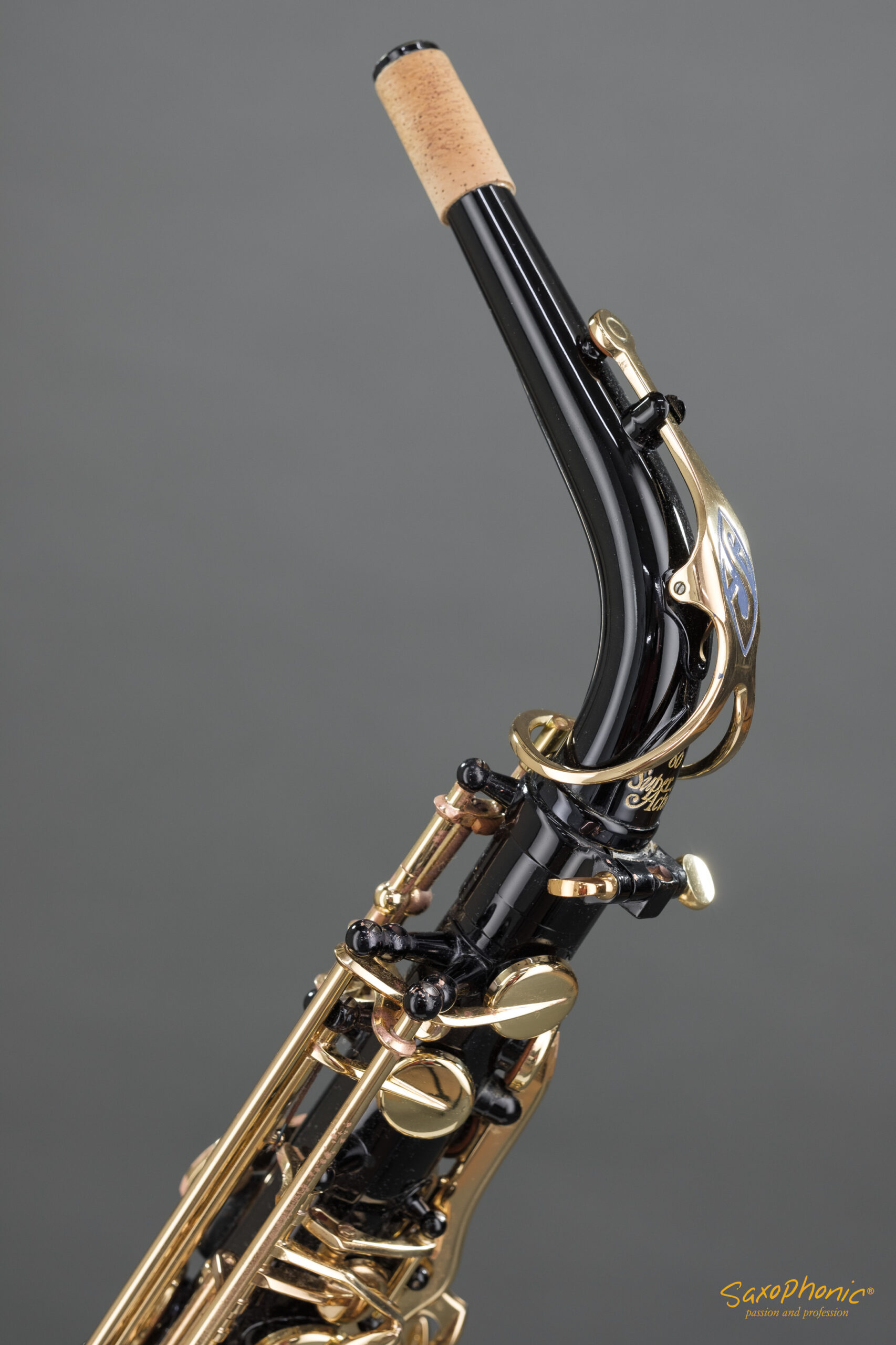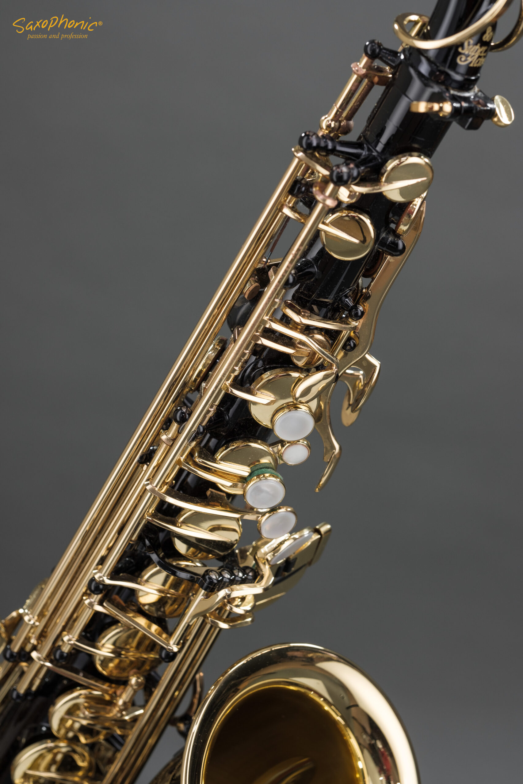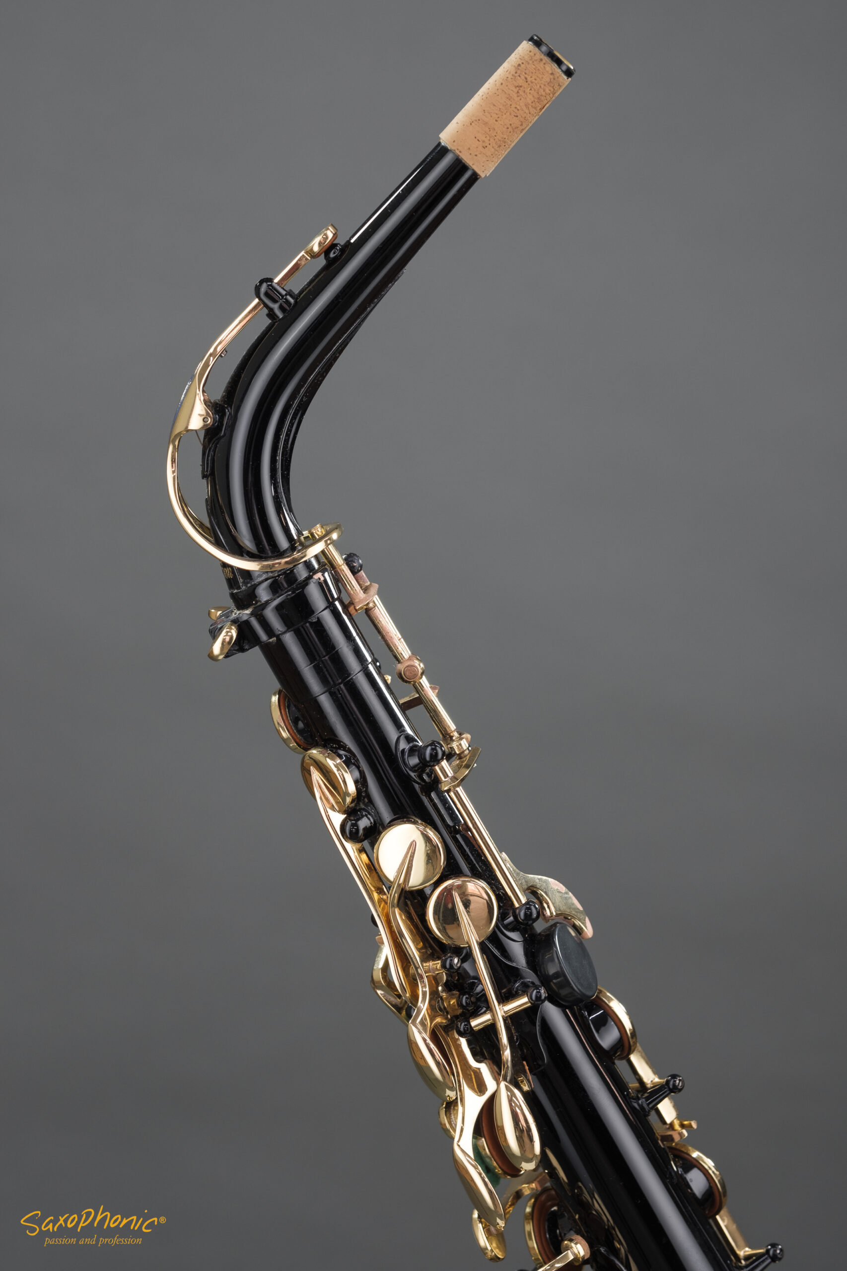 Dieses Altsaxophon stammt aus einer Saxophon–Sammlung, die aus 3 schwarz-goldenen Saxophonen besteht: