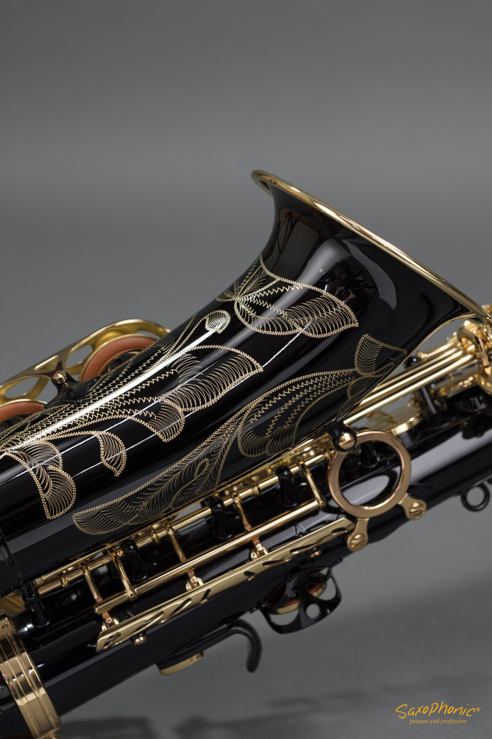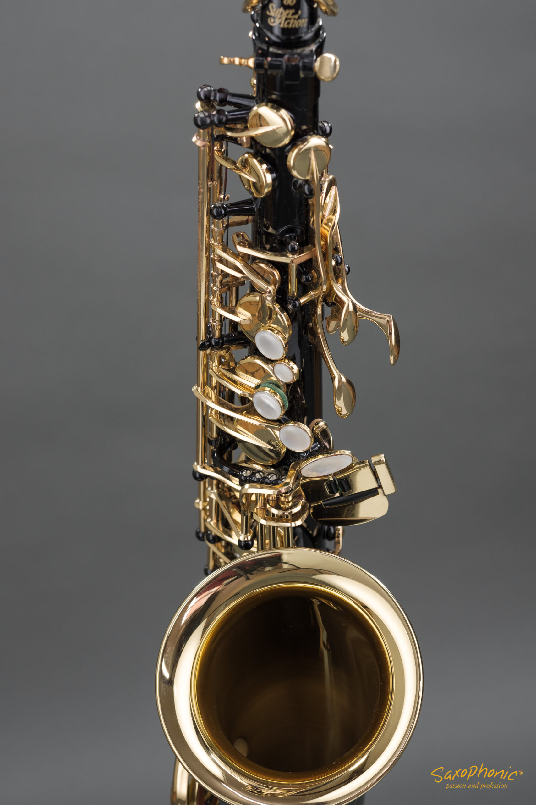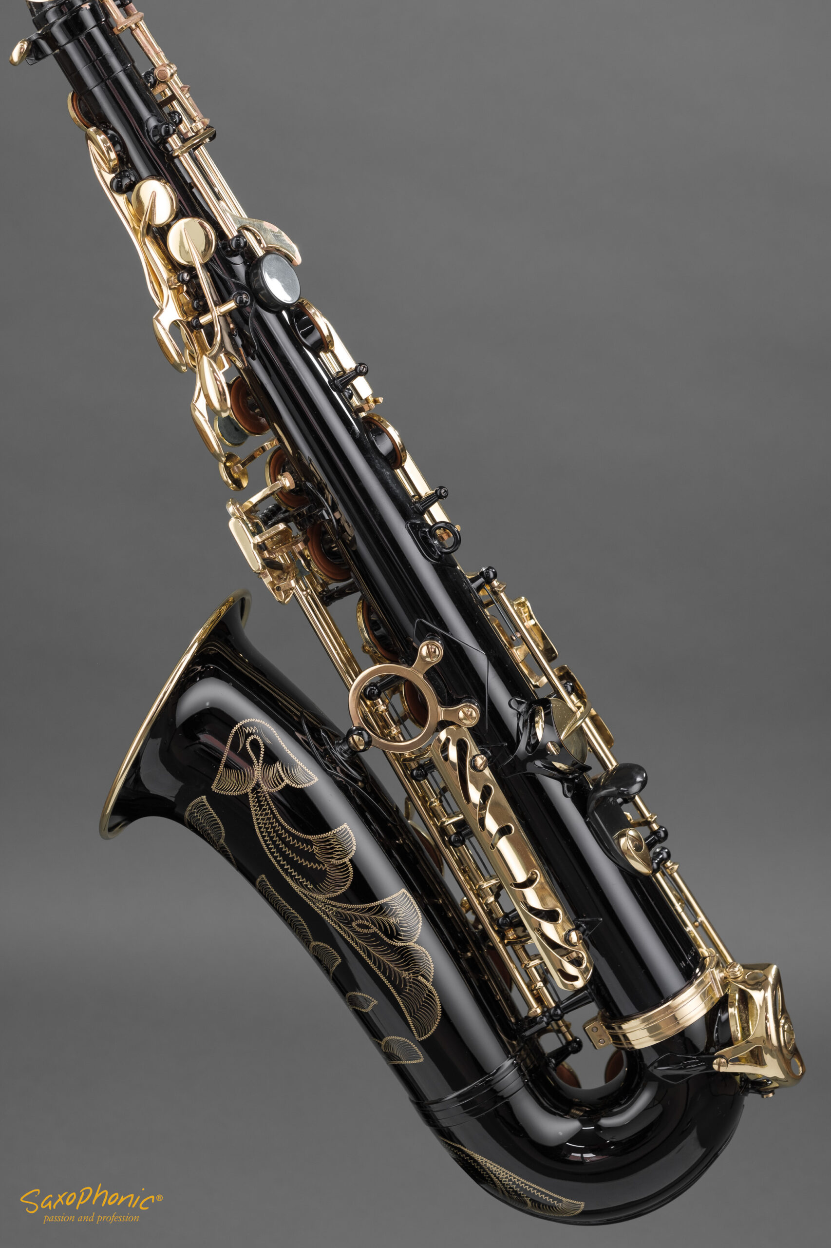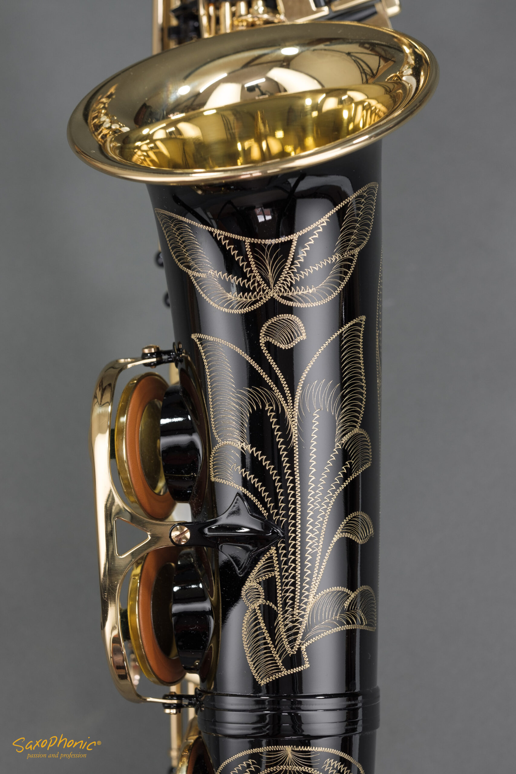 Dieses Altsaxophon stammt aus einer Saxophon–Sammlung, die aus 3 schwarz-goldenen Saxophonen besteht: