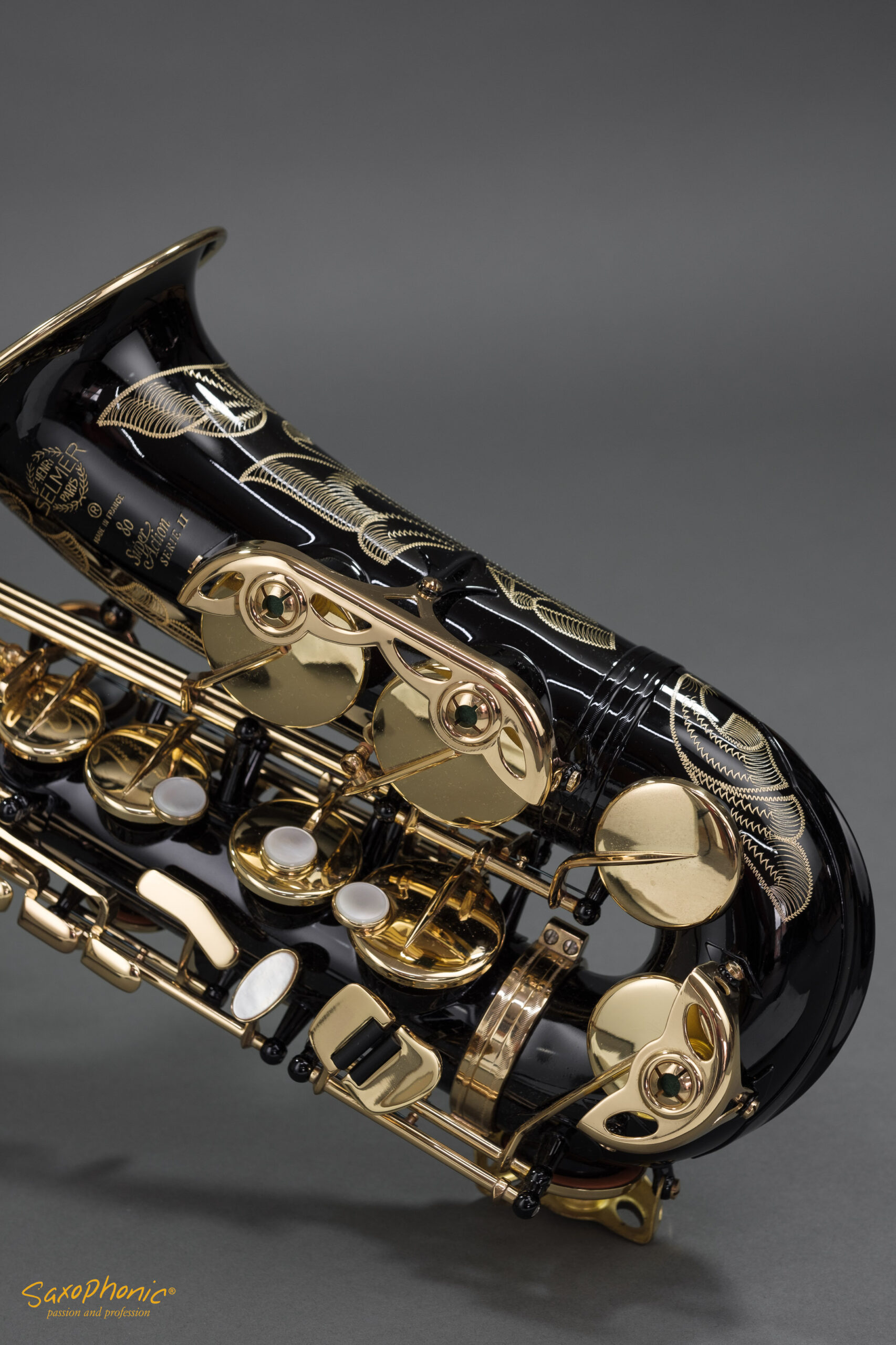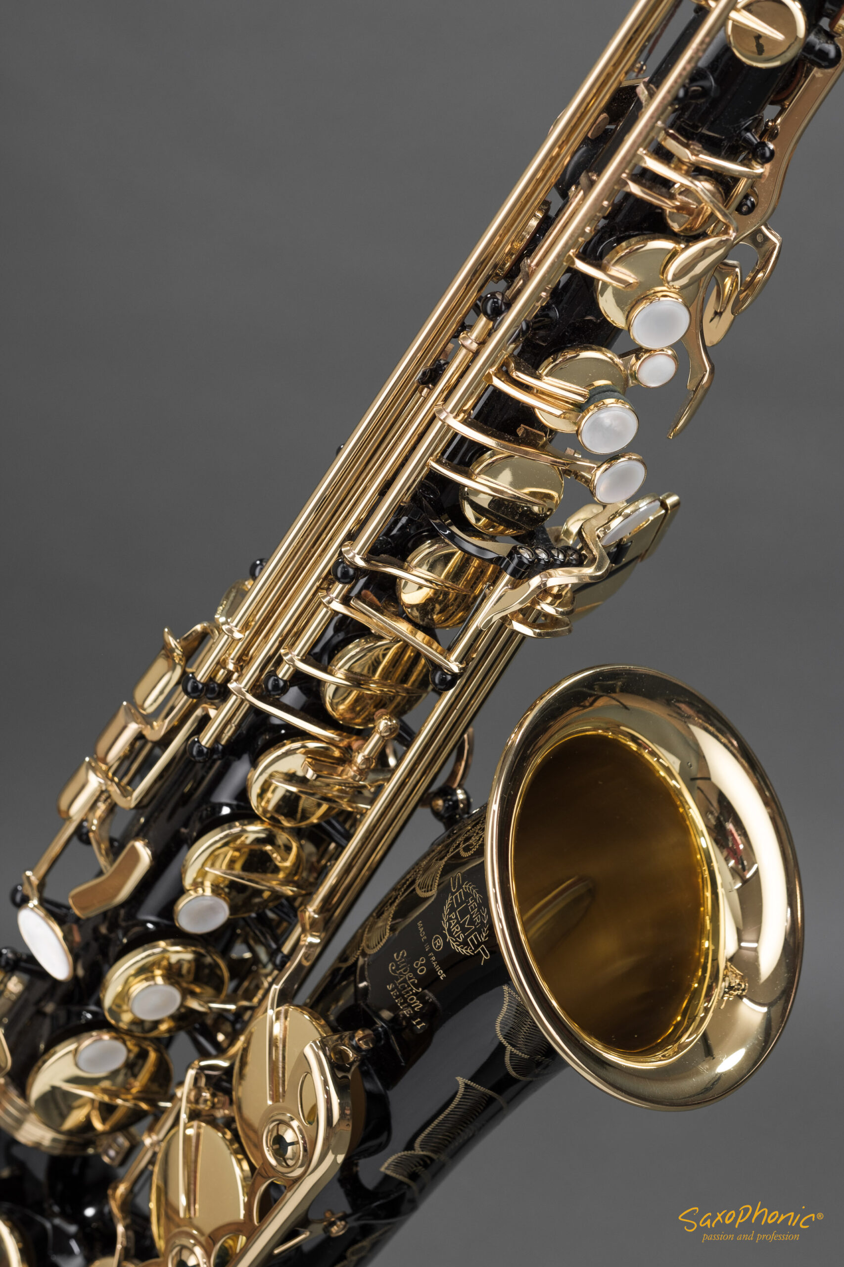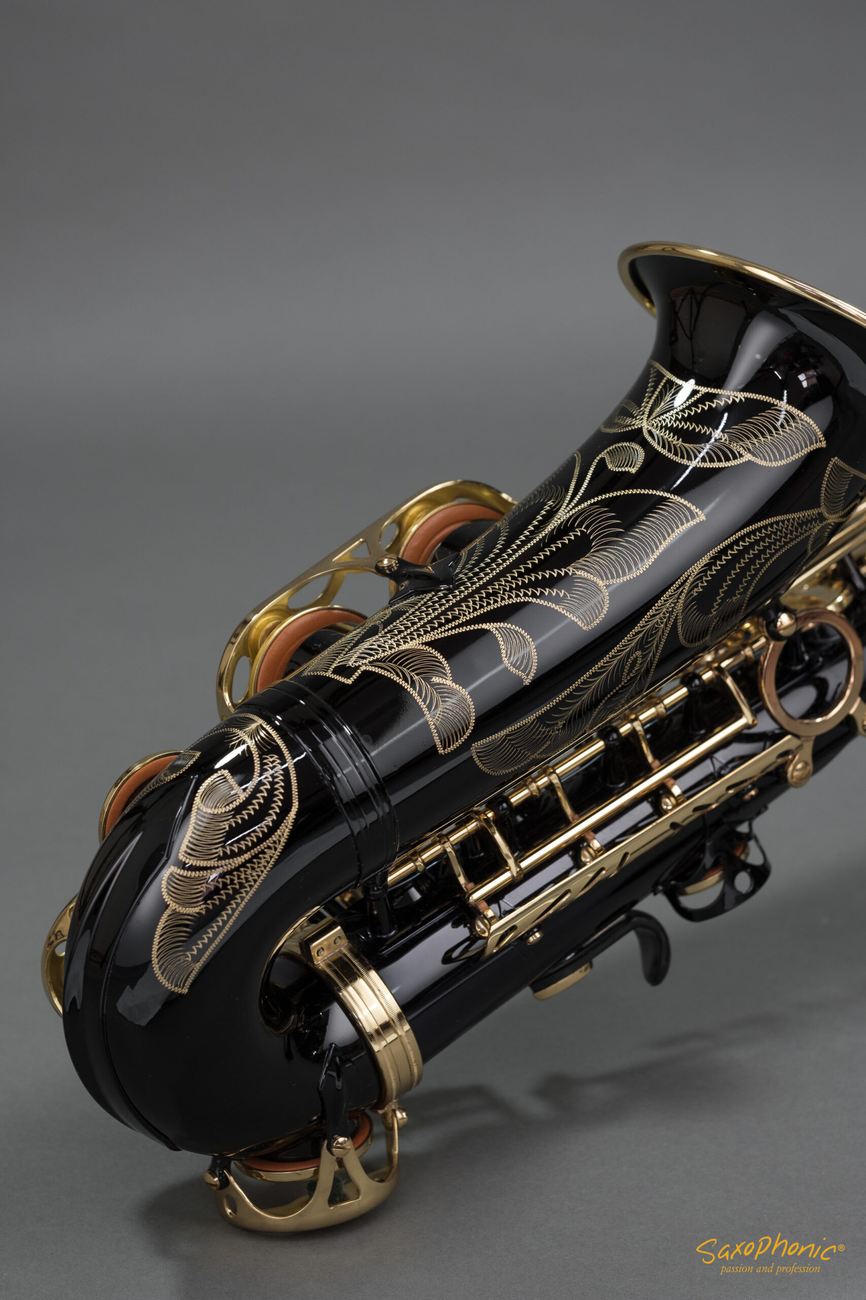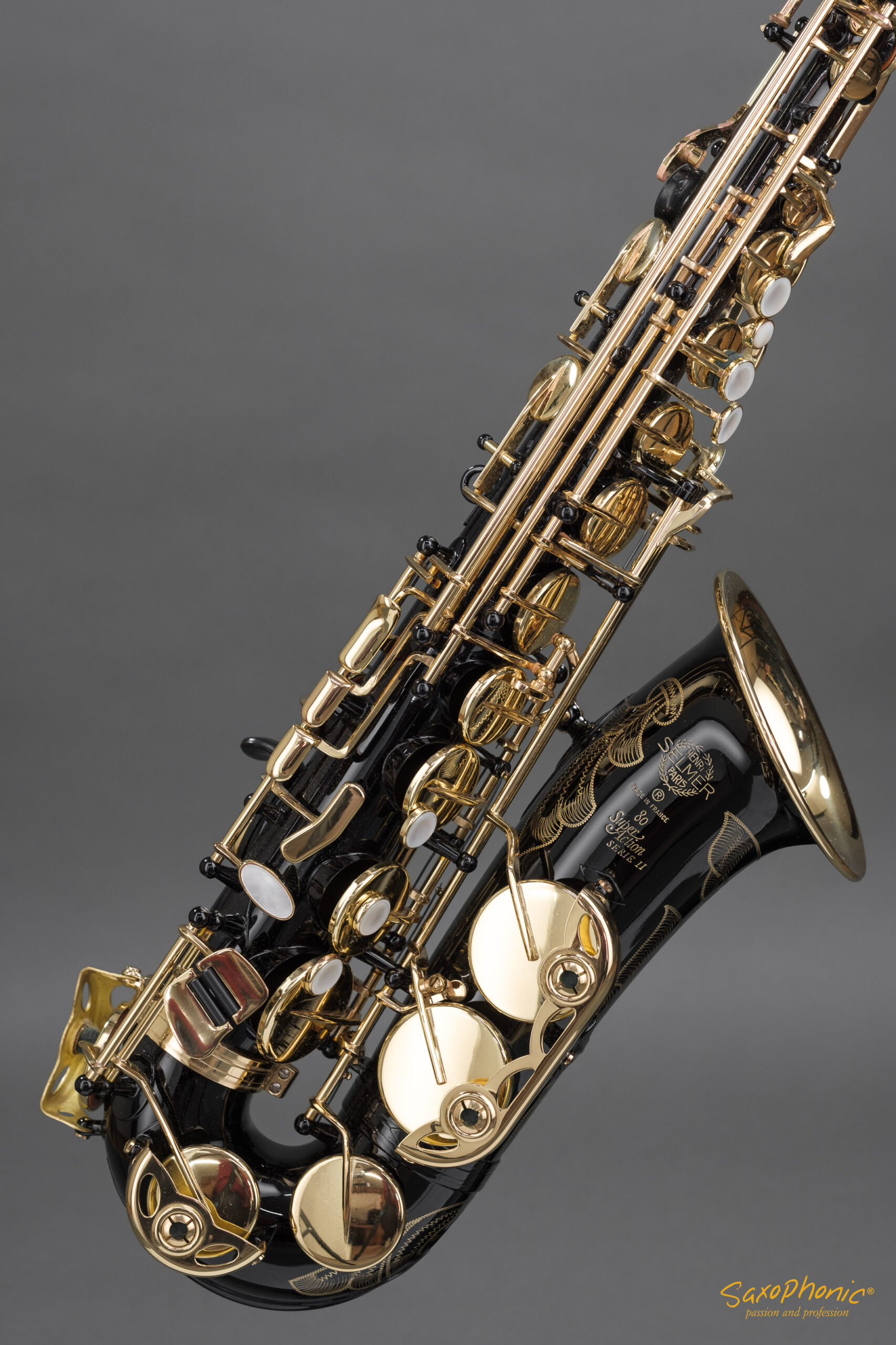 Dieses Altsaxophon stammt aus einer Saxophon–Sammlung, die aus 3 schwarz-goldenen Saxophonen besteht: