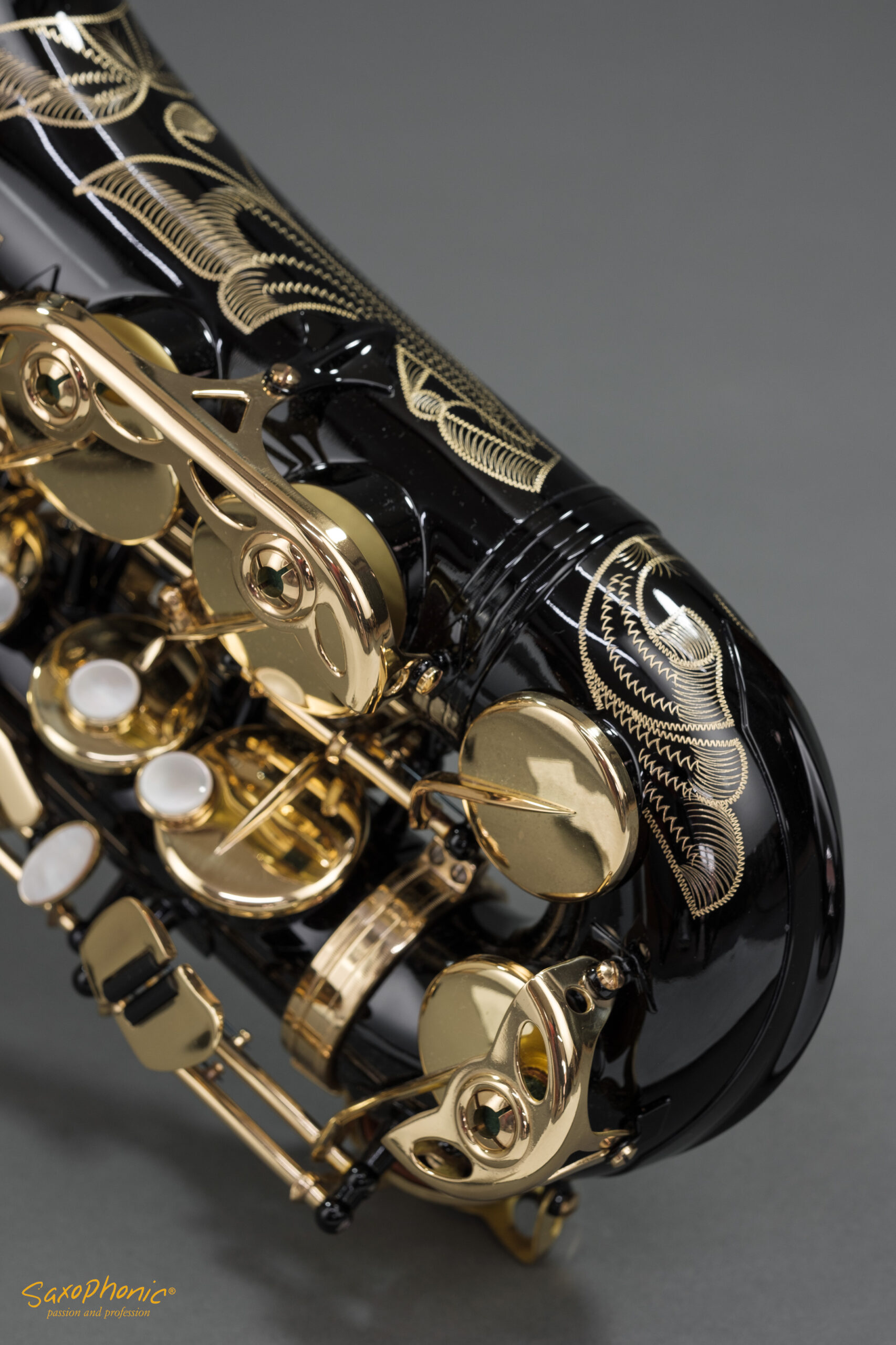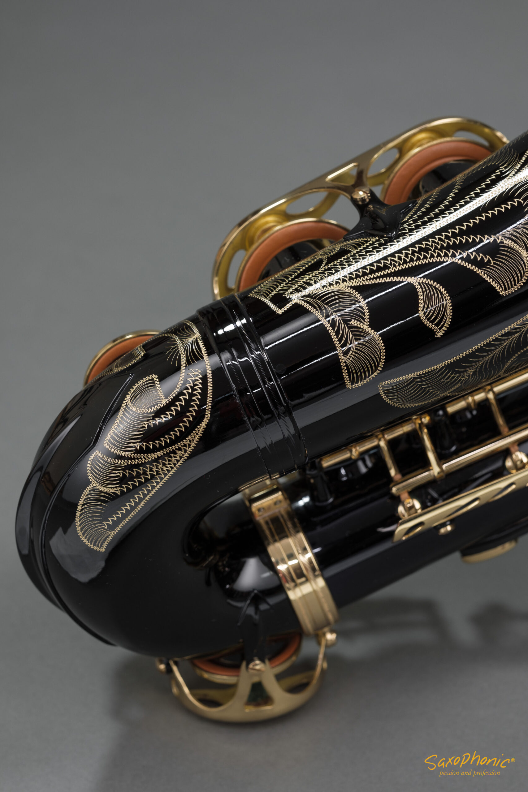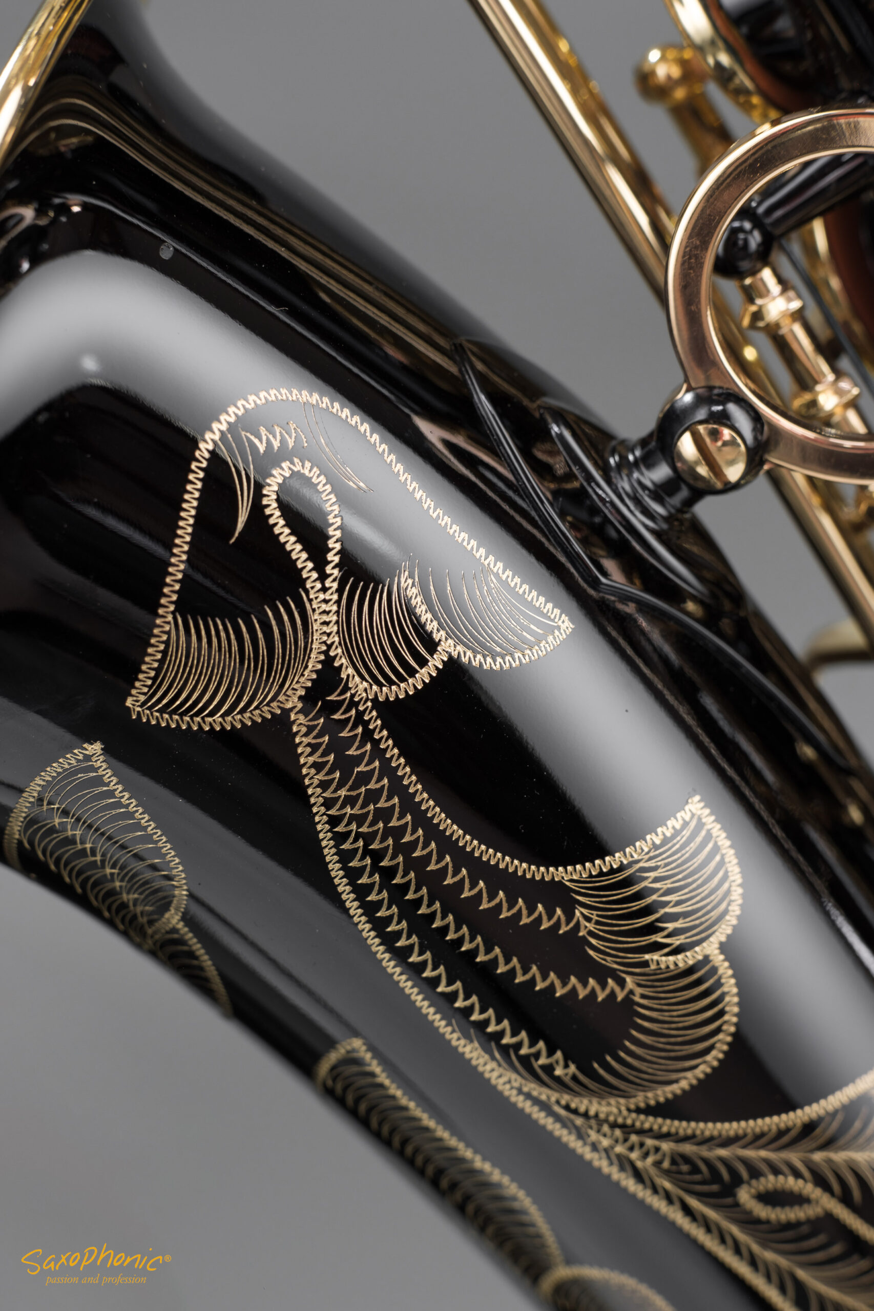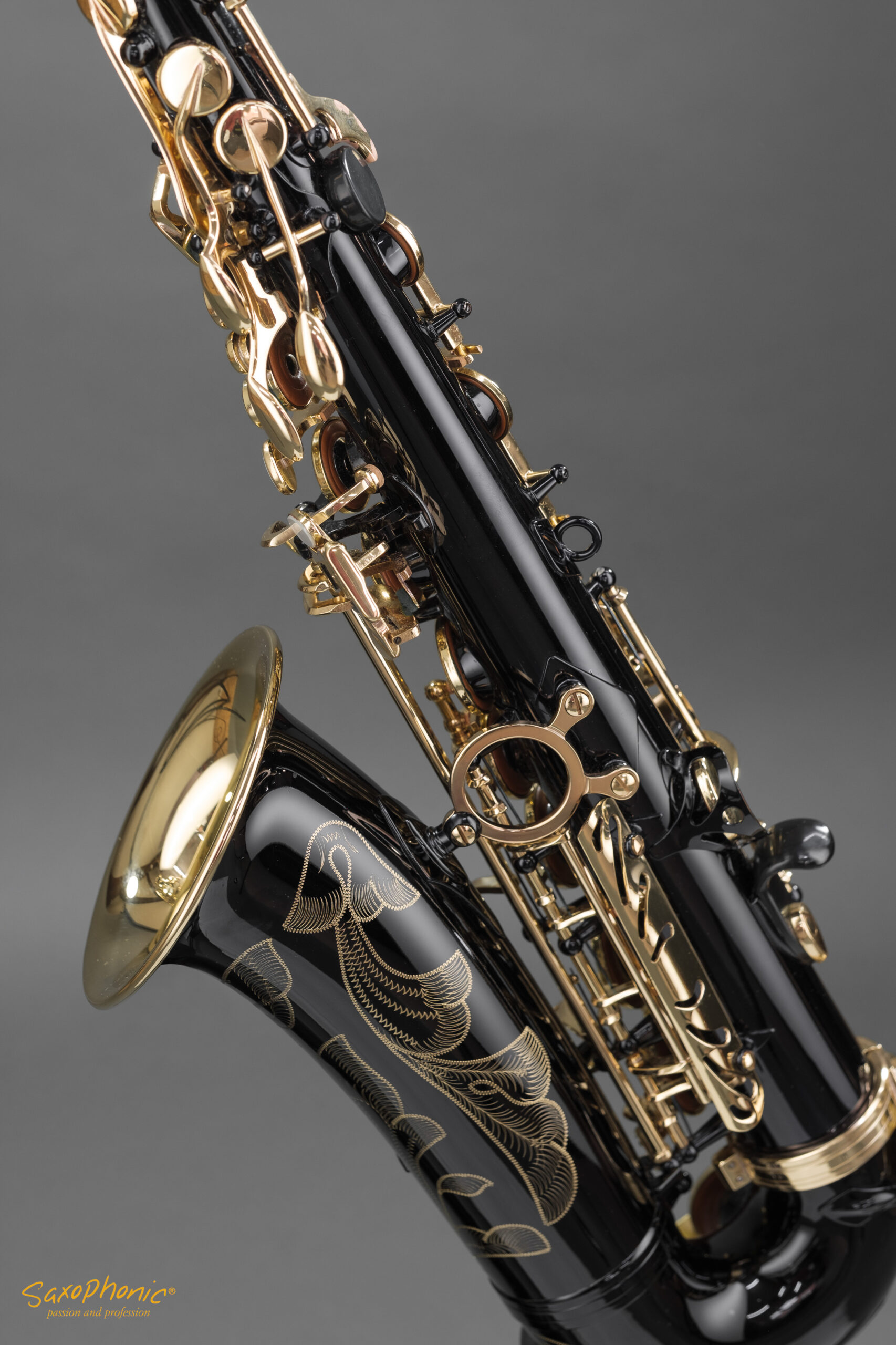 Dieses Altsaxophon stammt aus einer Saxophon–Sammlung, die aus 3 schwarz-goldenen Saxophonen besteht: