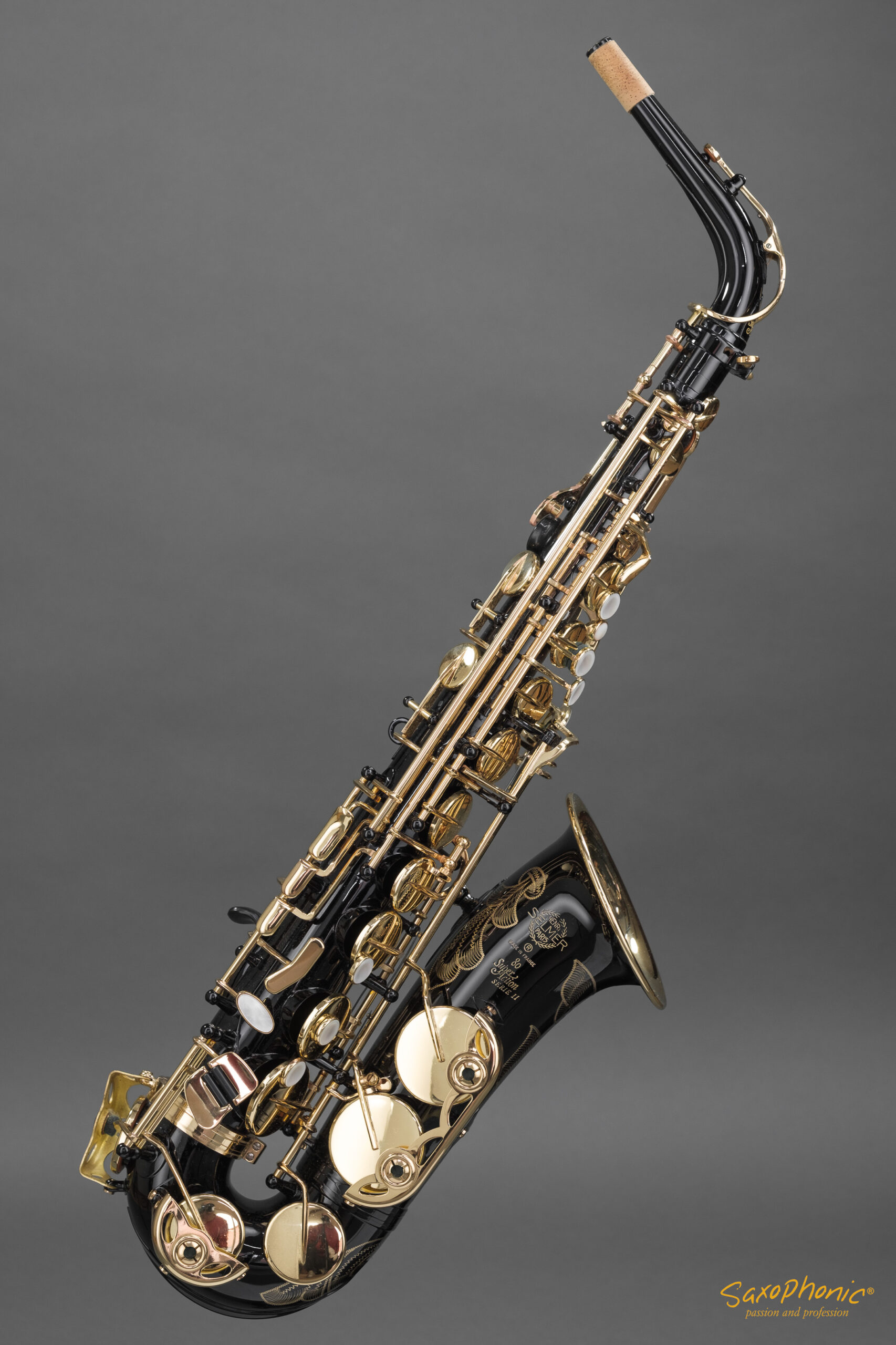 Neuwertiges, so gut wie nie gespieltes Altsaxophon SELMER Super Action 80 Serie II in seltener schwarz-goldener Ausführung!